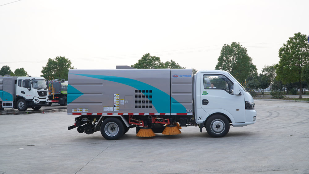 3、掃路車采用東風(fēng)純電動二類汽車底盤改裝,加裝風(fēng)機(jī)、清水箱、垃圾箱、左右立掃、帶噴水桿的寬吸嘴、掃盤降塵系統(tǒng)、液壓系統(tǒng)、專用裝置電控系統(tǒng)和副車架等改裝而成。