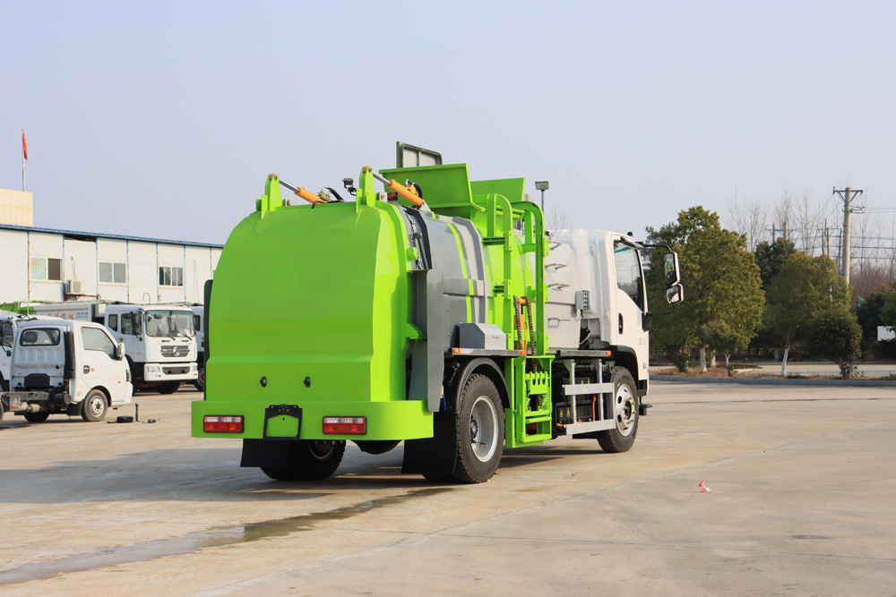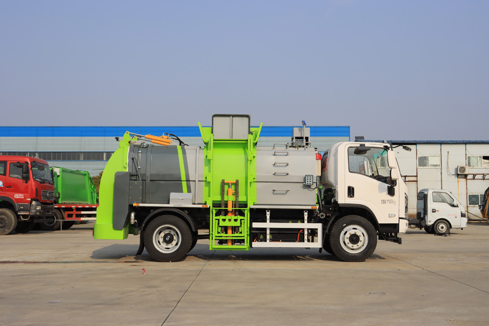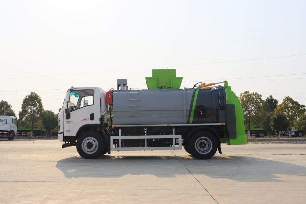 四、其他說明: 由于餐廚垃圾車上裝結構復雜,自質量較大,降低餐廚垃圾車自質量,提高其載荷 利用率,將降低車輛運營成本。因此采用高強度材料,以降低上裝自質量;擋泥板、裝飾件、蓋 板等輔助件采用密度較小的注塑件,采用集成化程度較高的零部件,以減少空間占用和自質量, 同時有利于改善液壓系統(tǒng)的工作性能。專人試車;模擬各種復雜工作環(huán)境,所有壓縮發(fā)車前實物測試。