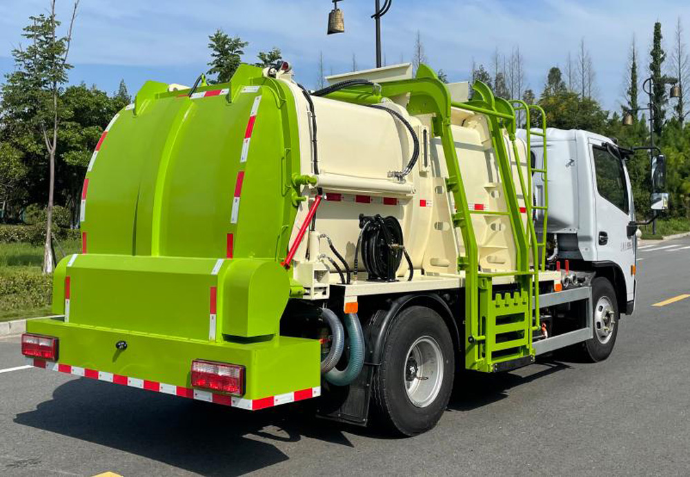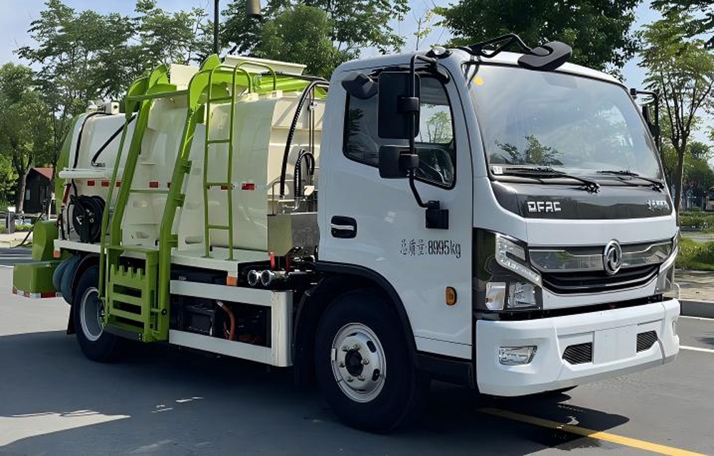 整車為全封閉型,采用電氣液一體化技術,借助機、電、液聯合自動控制系統,通過垃圾箱、上料機構和推鏟等專用裝置,實現垃圾收集和卸料。