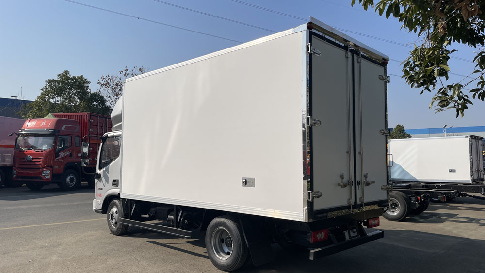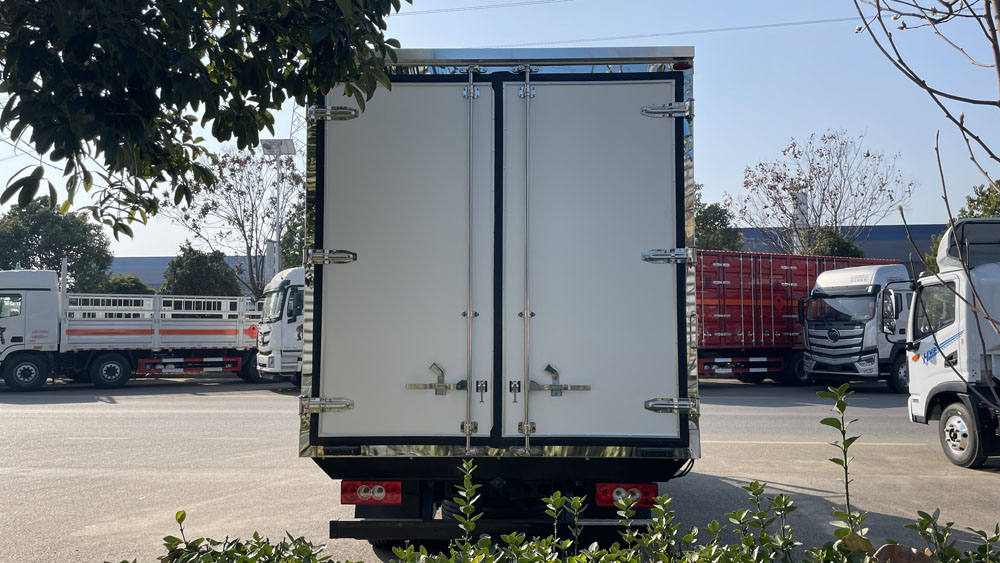 二、廂體配置:采用我司《晶龍工藝》專利技術(shù)——1200噸液壓加熱固化設(shè)備一體成型生產(chǎn)線制造,廂體保溫技術(shù)達到國家A級標準,廂體尺寸:080,3700×1960,2100×1800(mm)工藝特點:1、廂板采用全密封樹脂膠粘連聚氨酯發(fā)泡板高壓加熱固化而成,厚度8cm;2、廂板內(nèi)外面料為2.5mm厚新款納米玻璃鋼(不吸光,隔熱性好,硬度強,抗氧化);3、粘連輔料為玻璃纖維絲布;4、無空隙填充聚氨酯發(fā)泡保溫材料;5、全密封樹脂膠粘連;6、預(yù)埋實木加固廂體;7、防銹處理槽鋼框架支撐;8、鋁合金包邊、不銹鋼包角;9、內(nèi)部加裝LED照明燈及廂體示寬燈;10、后門框、鉸鏈、鎖件均為不銹鋼材質(zhì);11、后門加裝防撞膠塊;12、采用三元乙丙橡膠密封條。