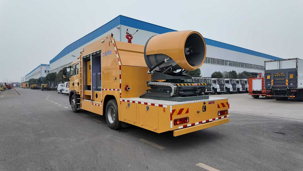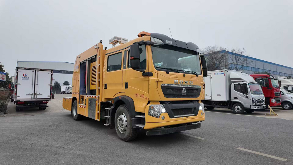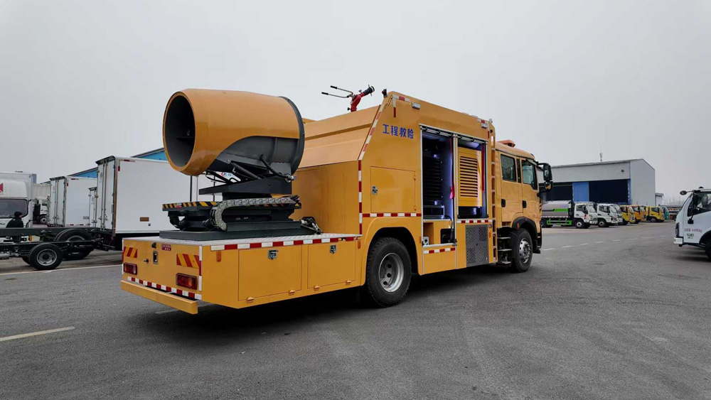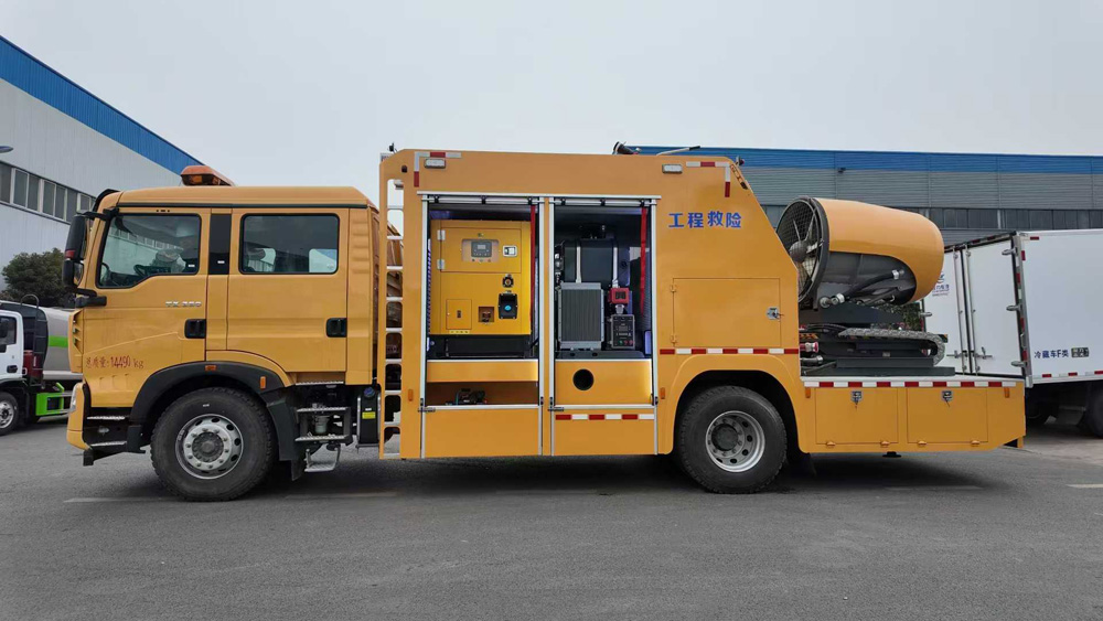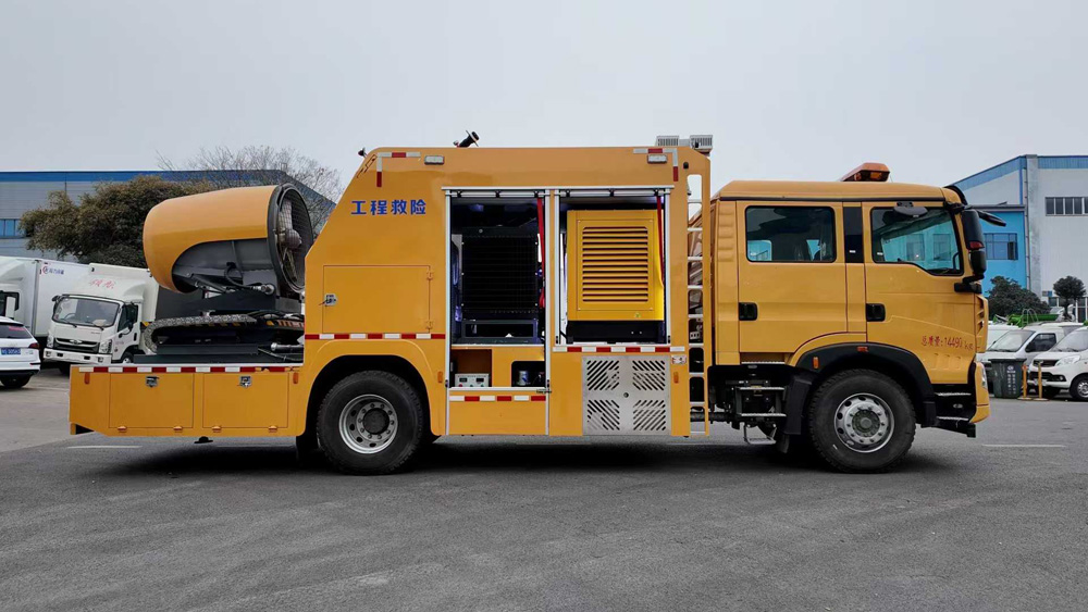 四、其他說明: 該車主要專用裝置為發(fā)電機(jī),送風(fēng)機(jī),用于為隧道,地下管廊排出內(nèi)部氣體,輸送空氣等.側(cè)面防護(hù)為裙板結(jié)構(gòu),材料均為Q235B碳鋼,后部防護(hù)裝置材料:Q235B碳鋼.