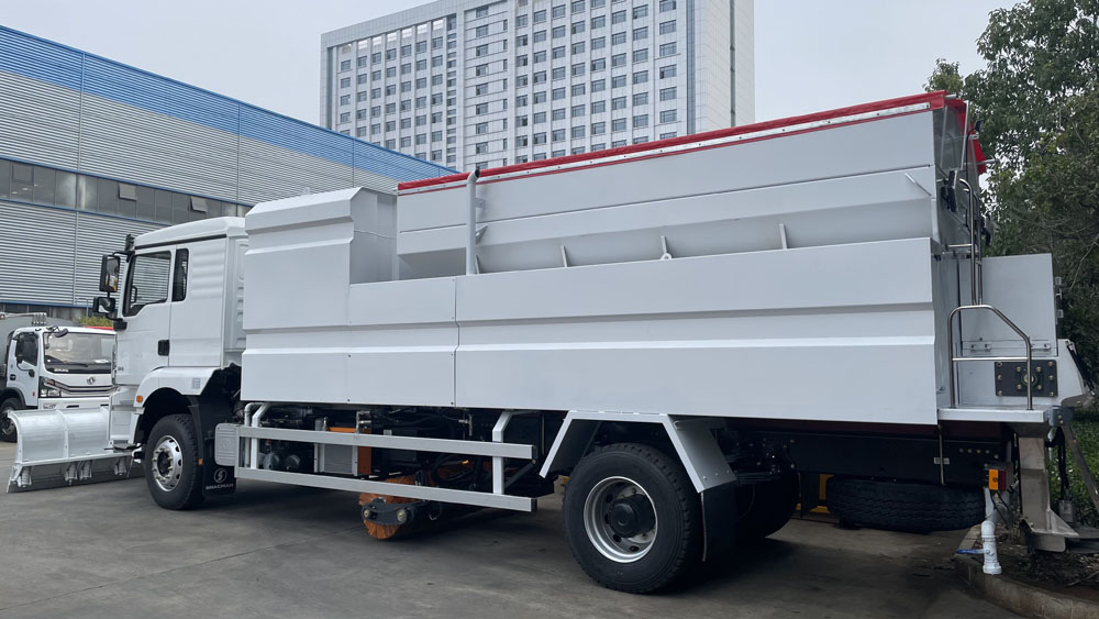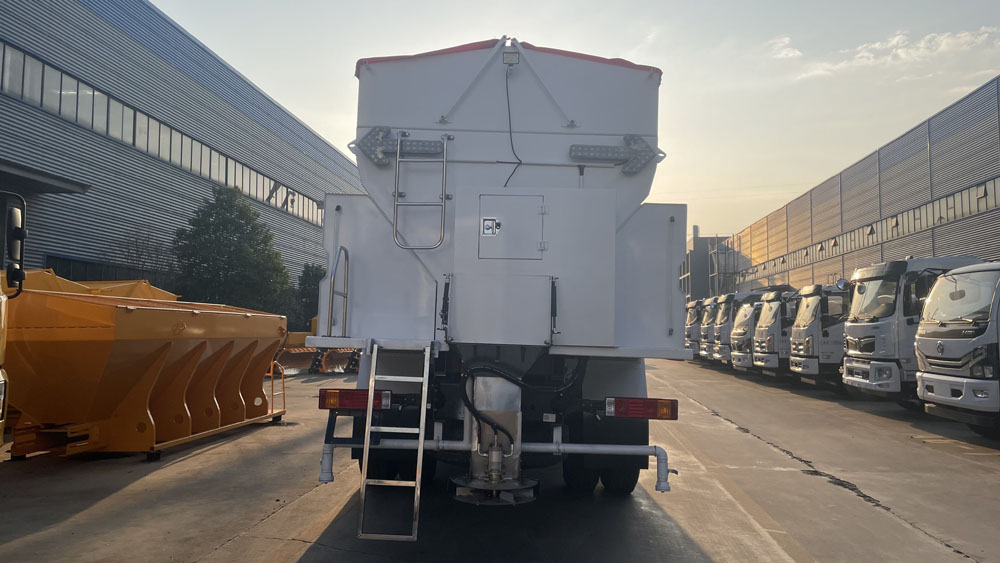 - 后置融雪撒布機:車輛尾部配備融雪撒布機,在冬季除雪過程中拋灑融雪劑,防止濕滑的路面結冰影響交通,覆蓋過融雪劑的路面能很好地解決路面結冰問題,使車輛安全通過,不受天氣影響 。